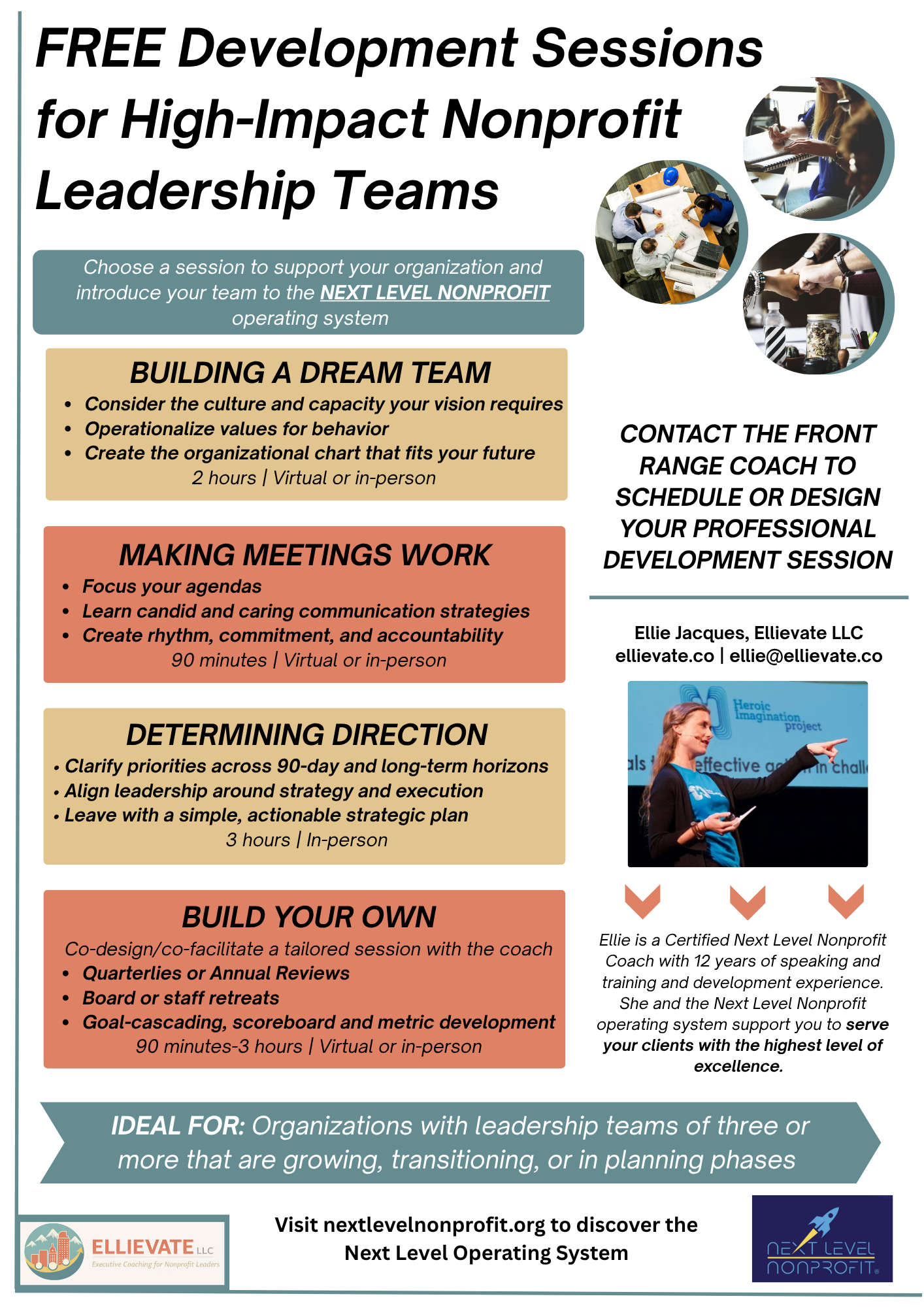 Together, we succeed in improving outcomes for your clients when I learn about the challenges and opportunities your organization faces and when your team commits to doing what it takes to go further, faster. My process is supported by my practice of the Next Level Nonprofit values: Relentlessly Pursuing Excellence, Bold Humility, and Building a Transformative Relationship with Partners.